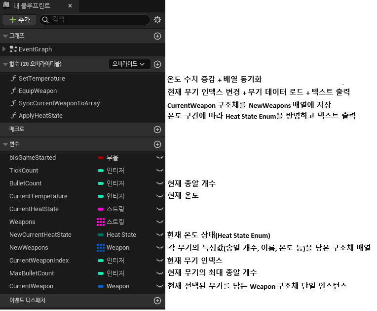 • Print String, Print Text로 현재 상태(총알 수, 온도, 과열 상태, 무기 이름)를 출력