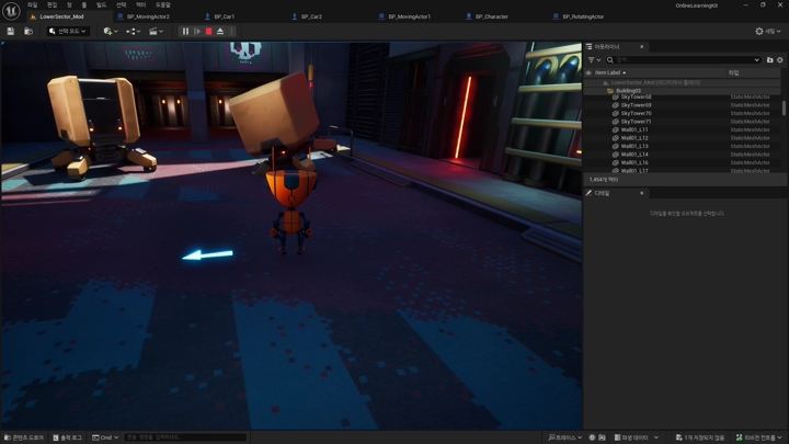 로봇의 앞에 보이는 차의 움직임이 타임라인을 적용한 액터의 이동이다.